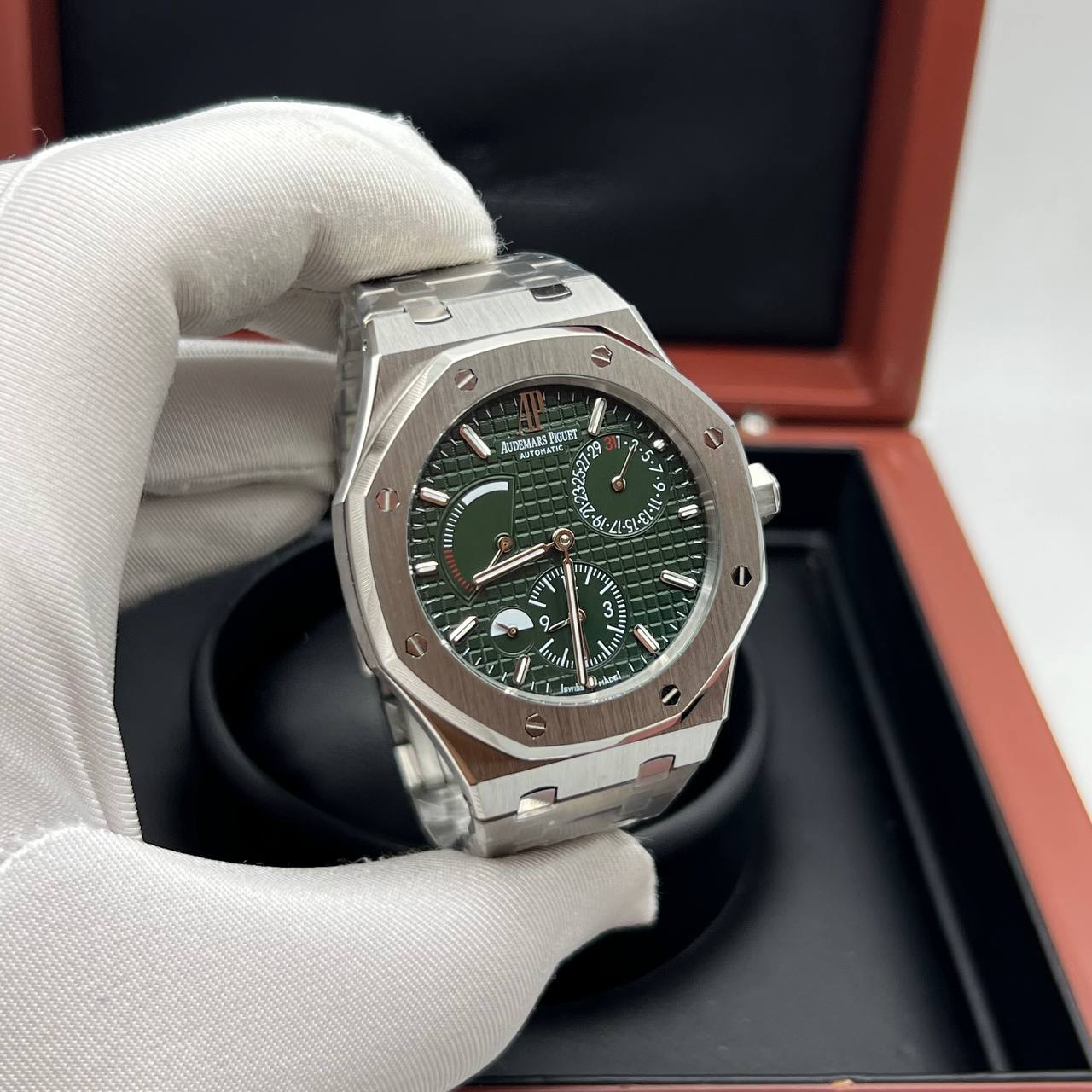 Часы Адемар Пиге - Роял Оак Дуал Тайм имеют следующие функции: Часы,минуты, секунды, дата, месяц, уровень заряда механизма.