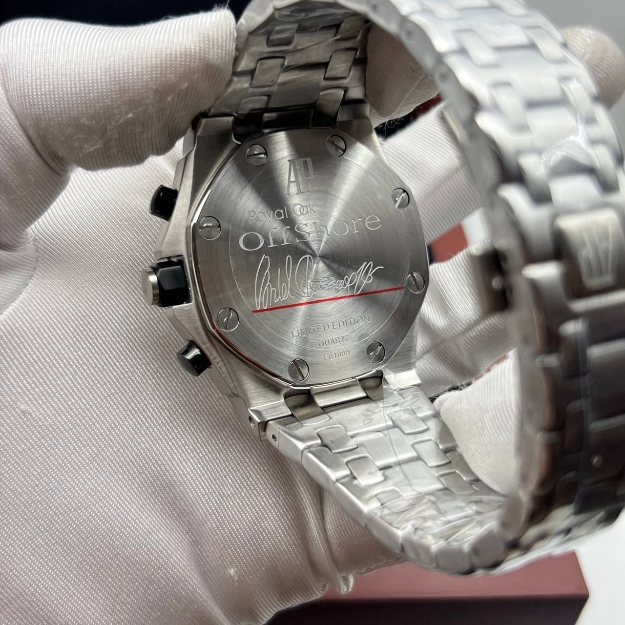 Довольно-таки стильные наручные часы, разработанные ведущей мировой часовой компанией. Корпус изготовлен из полированной гипоаллергенной часовой стали с высокими антикоррозийными свойствами. Стекло представленной элитной копии Audemars Piguet - Royal Oak Offshore Chronograph (0043.1) полностью сапфировое. Для закрепления на руке данной реплики часов предусмотрен стальной браслет, застежка раскладная, фирменная клипса автомат с логотипом бренда Копия часов Audemars Piguet - Royal Oak Offshore Chronograph (0043.1) имеет серийный японский механизм- OS1A с функцией хронограф;. Уровень водозащиты данной модели WR-30 - защищает механизм часов от незначительных попаданий влаги, к примеру во время мытья рук или дождя.