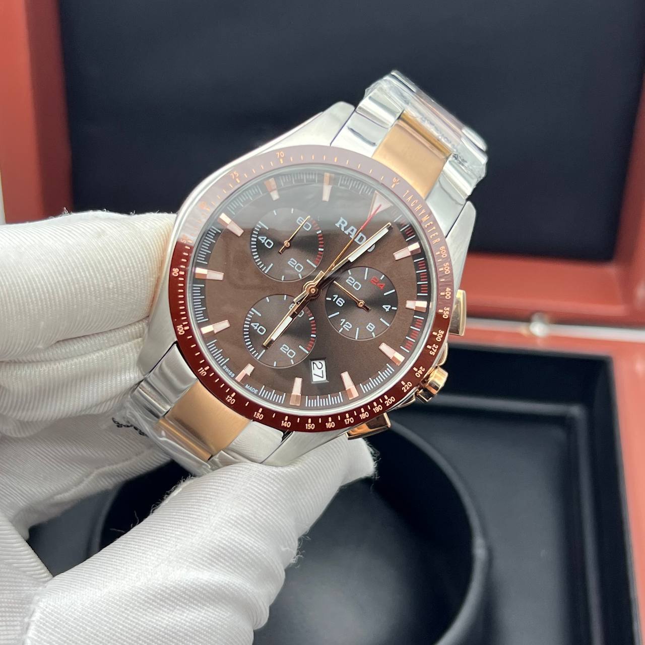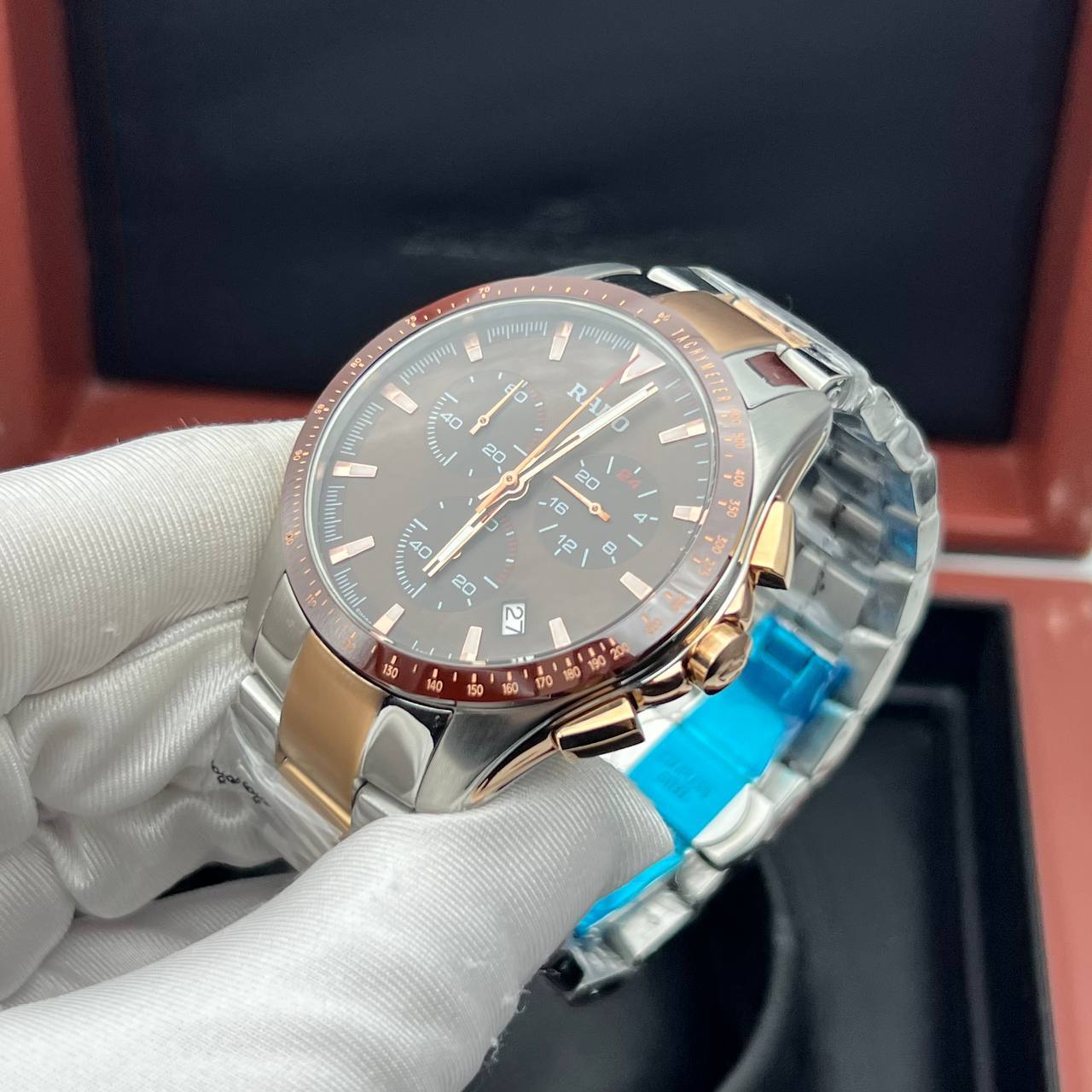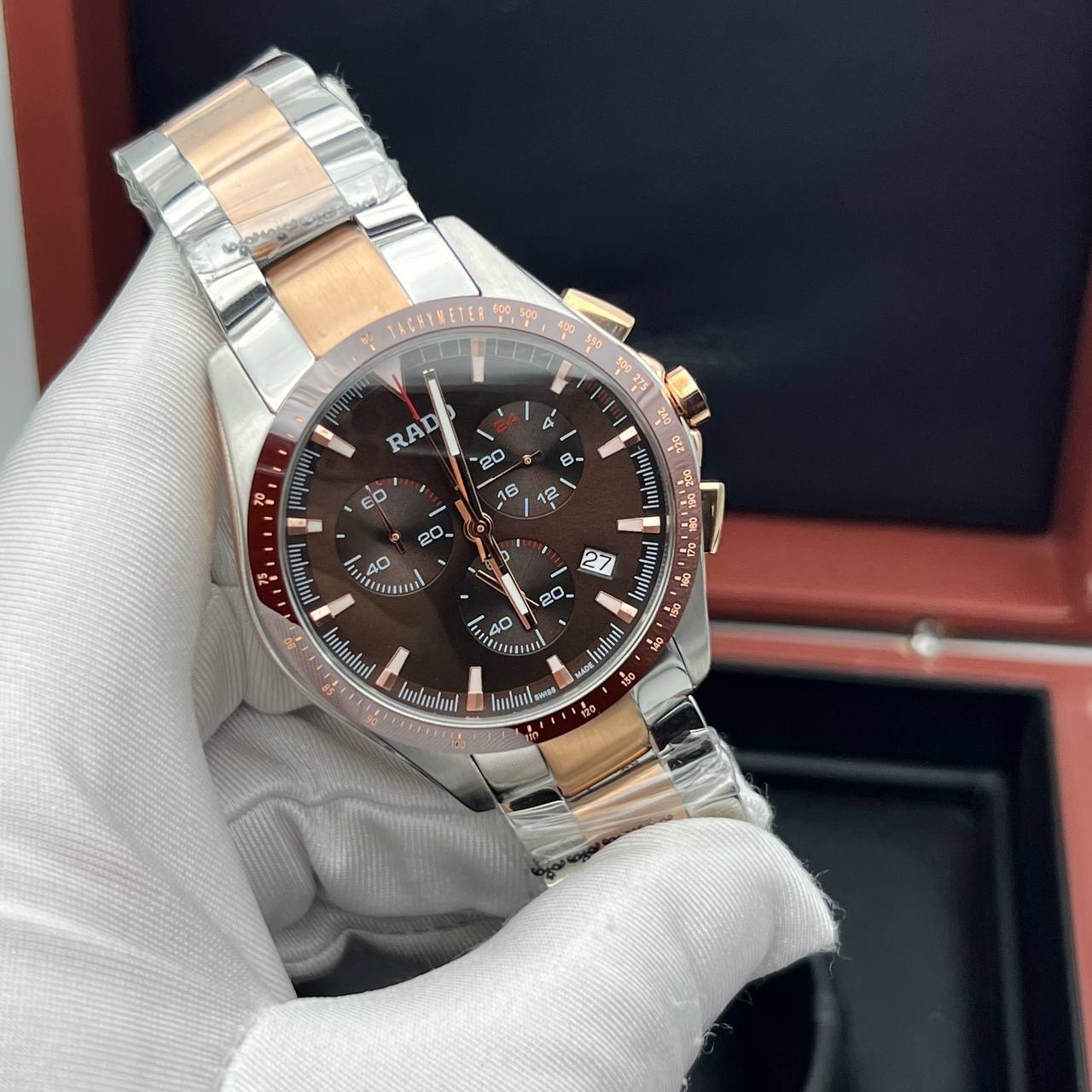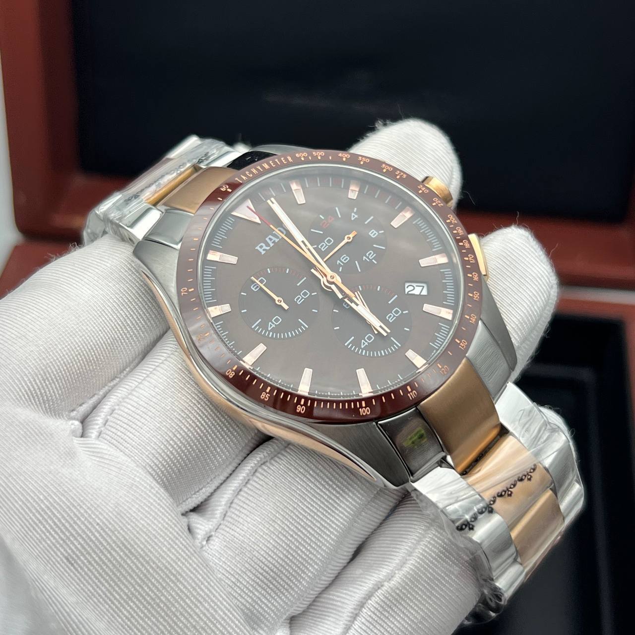 Реплика Rado показывает: Часы, минуты, секунды, дата, формат 24 часа, хронограф.
