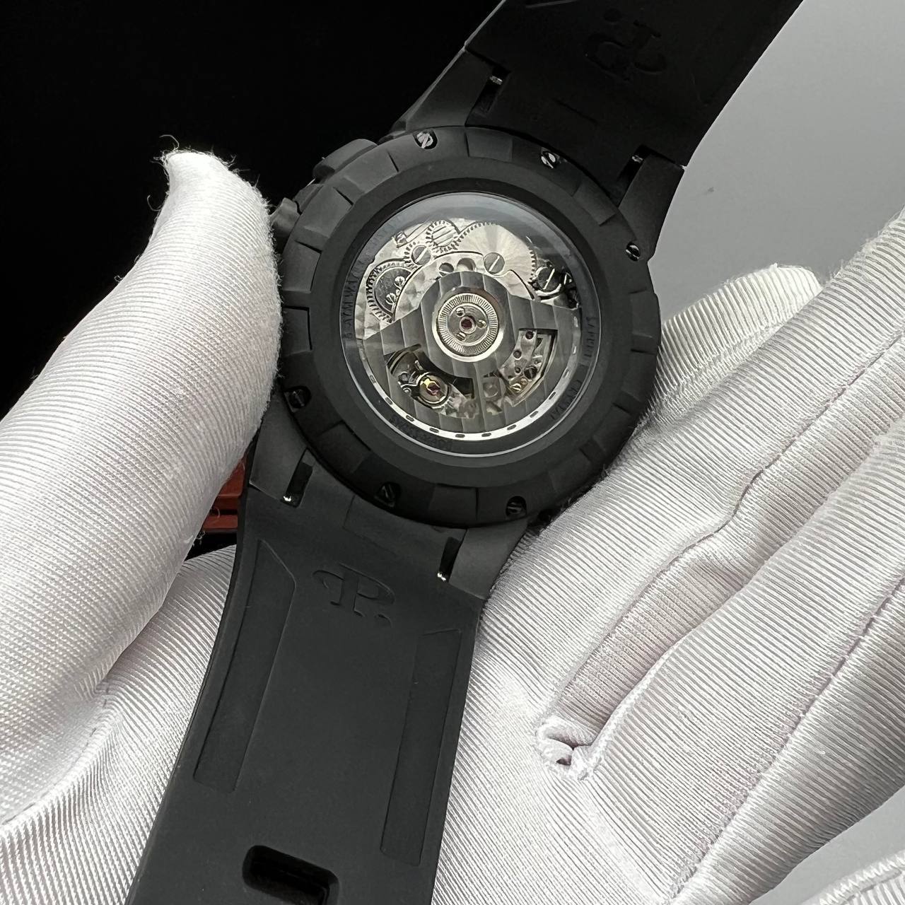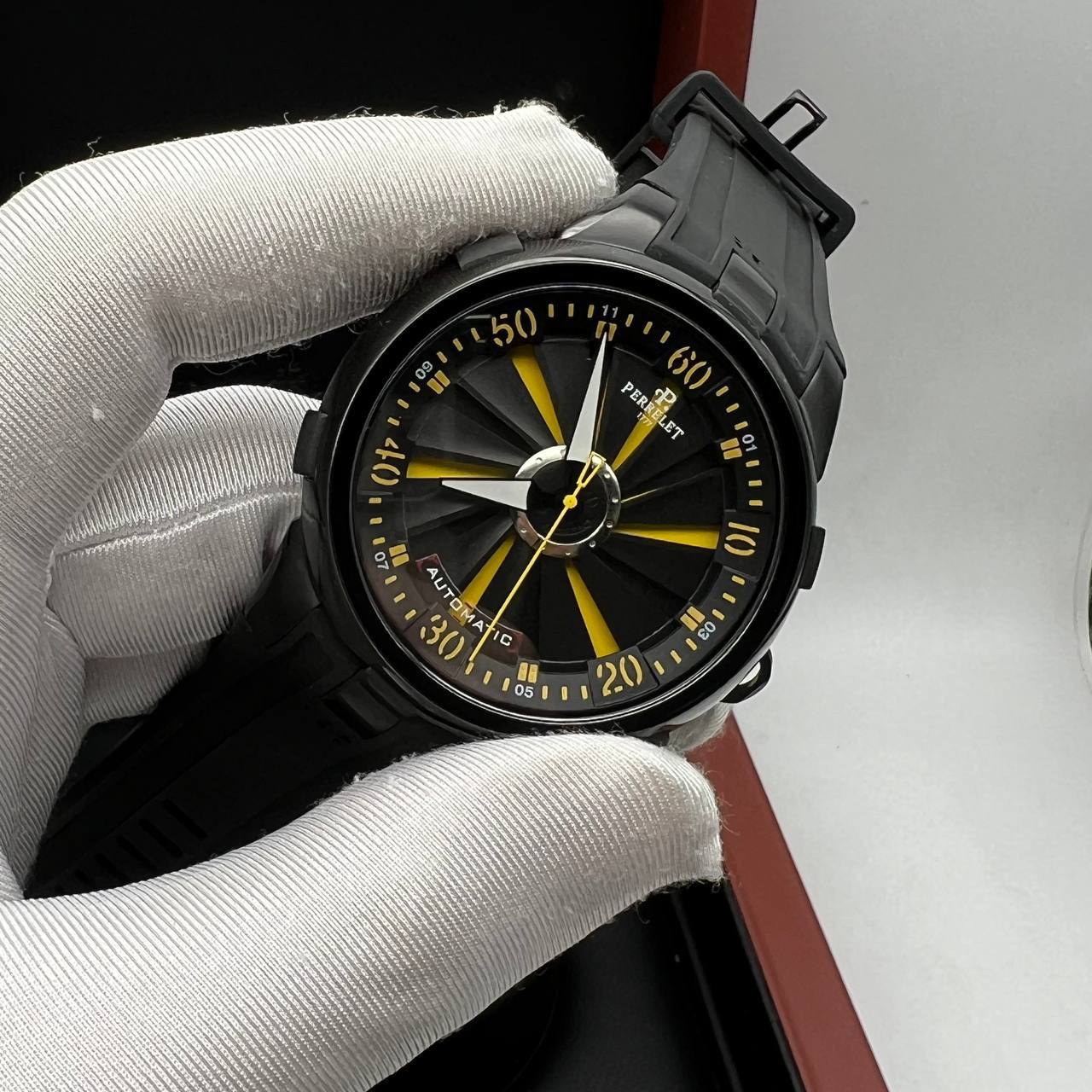 Уникальные часы которым нет подобных, эксклюзивный дизайн, технологичность и качество делают часы Perrelet единственными и неповторимыми. Корпус копии Perrelet - Turbine XL A1051/5 (8300.2) изготовлен полированной гипоаллергенной часовой стали с черным PVD покрытием;. На представленной модели установлено высокопрочное сапфировое стекло, которое не подвергается царапанью. Каучуковый ремешок черного цвета выполнен из натурального каучука c тиснением в виде логотипа бренда, литая застежка - объемная пряжка из нержавеющей стали с чернением дополняют общий индивидуальный образ этой модели.