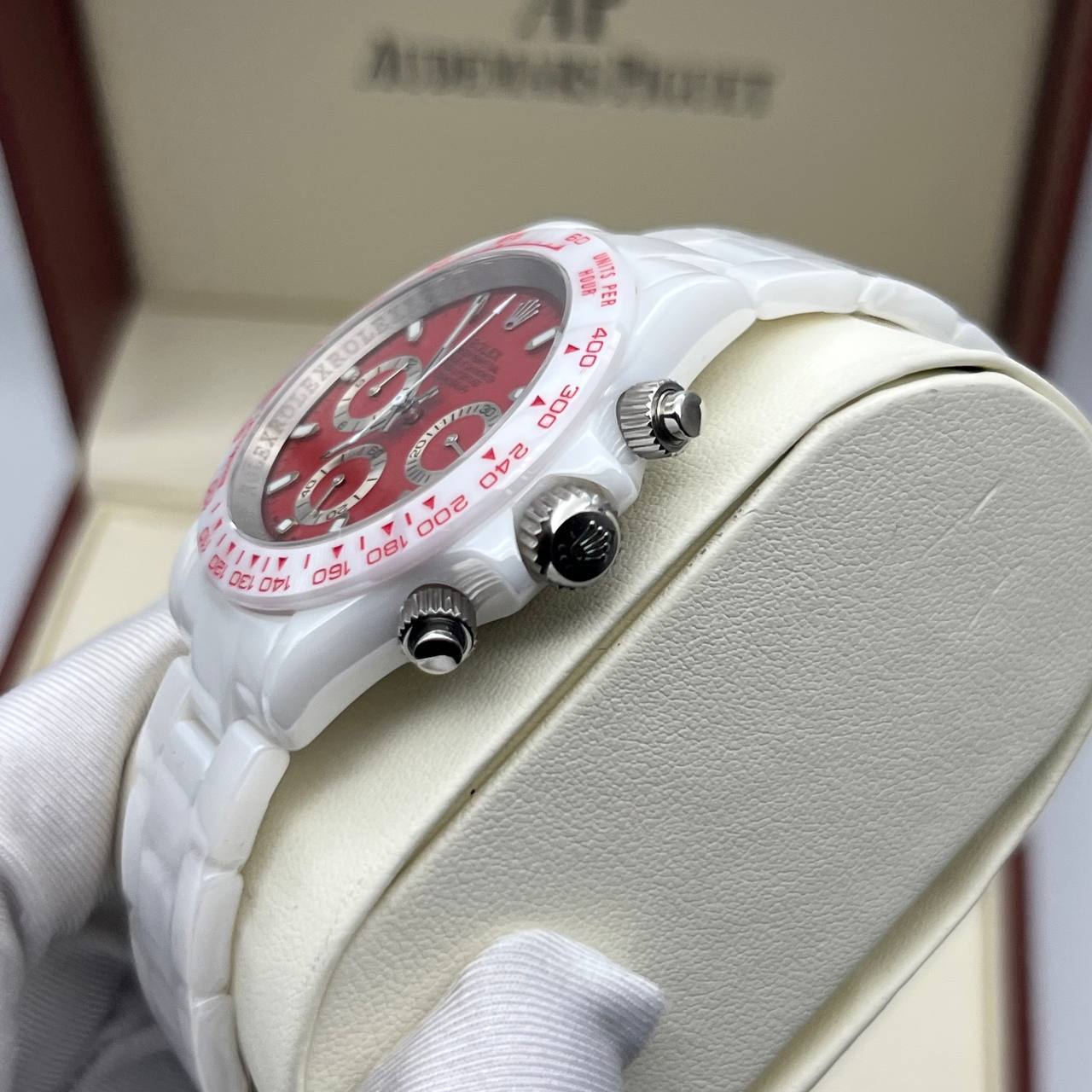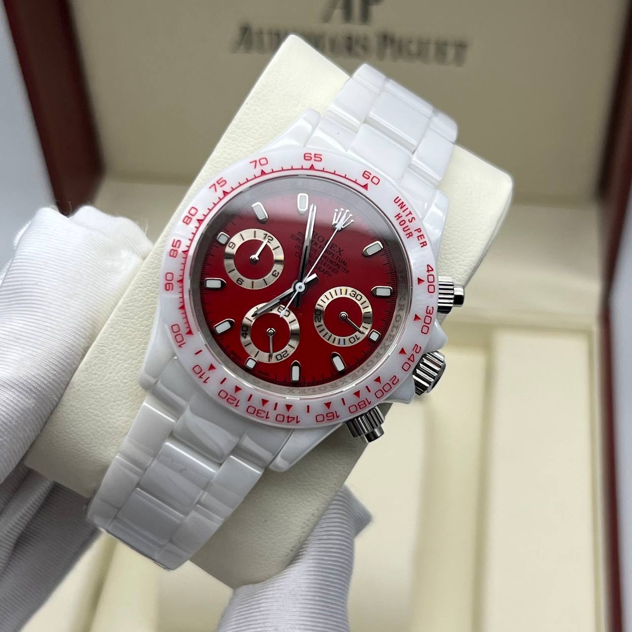 Корпус копии Rolex - Cosmograph Daytona AET Remould Rodin Collection "Abu Dhabi" (8827.6) часов изготовлен из матированной белой керамики, кнопки, заводная головка из гипоаллергенной стали. Стекло — сапфировое. Браслет - матированная белая керамика с клипсовой застежкой «бабочка». Механизм копии Rolex - Cosmograph Daytona AET Remould Rodin Collection "Abu Dhabi" (8827.6) — японский, Miyota (кварцевый хронограф). Копия Ролекс имеет водозащиту WR-30, которая надежно защищает механизм часов от незначительных попаданий воды и влаги (к примеру во время дождя или мытья рук). Размеры данных часов: 40 х 12 (мм).